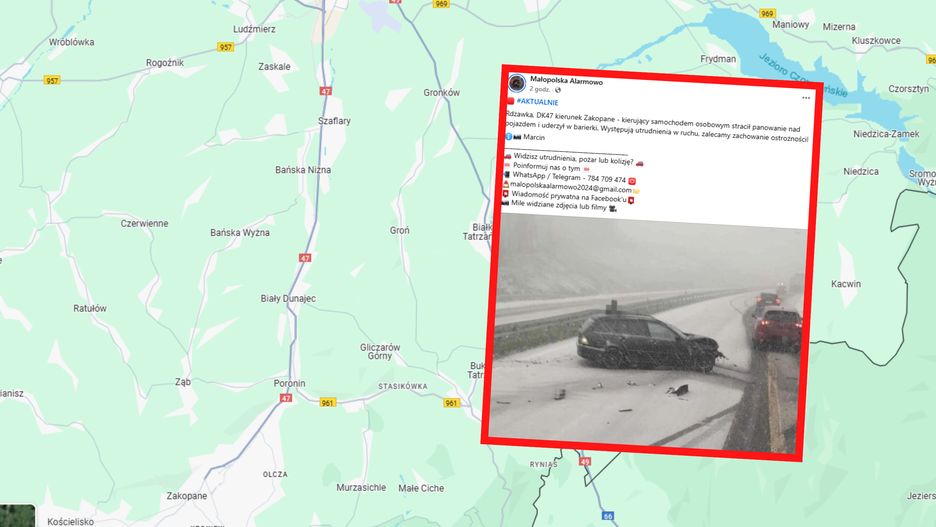 Rdzawka, DK47 kierunek Zakopane - kierujący samochodem osobowym stracił panowanie nad pojazdem i uderzył w barierki. Występują utrudnienia w ruchu, zalecamy zachowanie ostrożności! - napisano.