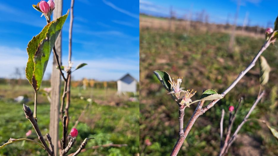 Na nadesłanych nam zdjęciach widać, że jabłonie w listopadzie budzą się ze snu i powoli zaczynają owocować. To bardzo niepokojące. Niestety, chociaż wygląda to bardzo uroczo, może stanowić problem dla sadowników.