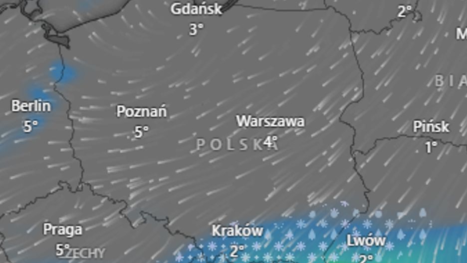 Na pozostałym obszarze kraju zachmurzenie będzie małe i umiarkowane, z możliwymi przelotnymi opadami na zachodzie. Temperatura maksymalna wyniesie od 4 do 9 st. C, a w rejonach podgórskich od 0 do 3 st. C. Wiatr będzie słaby i umiarkowany, z kierunków północno-wschodnich.